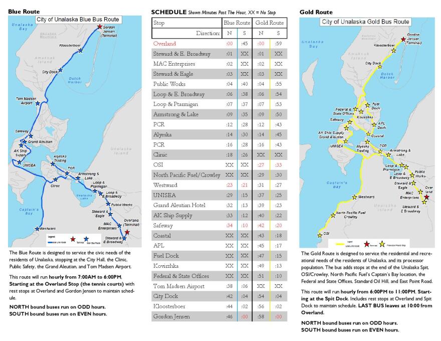 The daytime route runs from Overland Drive to the back of the Spit with almost 20 stops, including City Hall, Westward Seafoods, the grocery stores, and the airport.